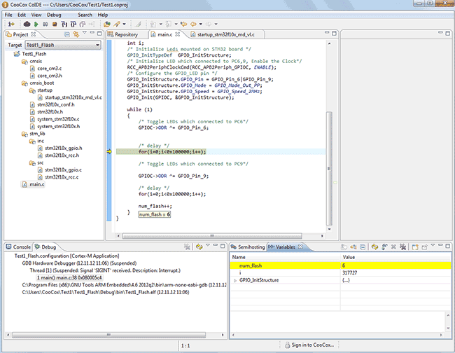 Также, в CoIDE работают различные режимы отладки, для этого нажимаем CTRL+F5 (или в меню Debug->Debug):
