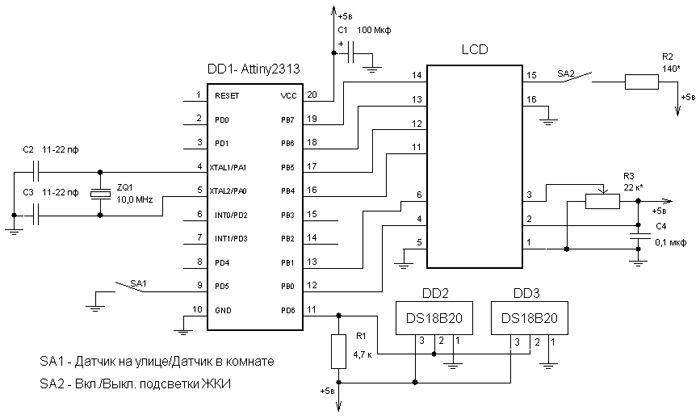 Переключатель SA1 предназначен для переключения датчиков, с которыми ведется информационный обмен.PЕсли переключатель разомкнут, то работа ведется с датчиком в комнате, если замкнут, то с датчиком на улице. При переключенииPдатчиков Pприсутствует инерционность (до 845 мс.), обусловленная проверкой состояния переключателя перед подачей команды измерения. В устройстве использован кварц на 10 МГц. Схема работоспособна, если микроконтроллер работает от внутреннего генератора 8 МГц. (При программировании фуз в обоих случаях не забываем установить CKDIV8 в лог. 1, т.е. отключить деление тактовой частоты на 8)