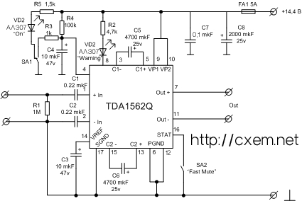 Хочу предложить свою версию мощного УНЧ на микросхеме TDA1562Q (см. рис.)- Мой вариант - это усовершенствованная схема из публикации. Подробное описание микросхемы TDA1562Q можно найти в справочниках по УНЧ.