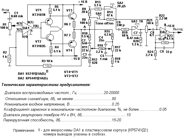 В усилителе применены сдвоенные переменные резисторы R11 и R17 любого типа группы Б, R1 и R21 любого типа группы В или А. В качестве тонокомпенсированного регулятора громкости (R21) можно примененить переменный резистор 100 кОм (с отводом от середины). Транзисторы можно заменить на КТ3107И, КТ313Б, КТ361В,К (VT1, VT4) и КТ312В, КТ315В (остальные). Замена ОУ К574УД1 на ОУ других типов не рекомендуется. При значительном уровне постоянной составляющей (в редких случаях) в точке А необходимо установить конденсатор емкостью 2.2 - 5 мкф. Описываемый ПУ подключается к усилителю мощности ЗЧ с входным сопротивлением не менее 10 кОм. Со значительным увеличением Кг, данный ПУ можно нагрузить и на УМЗЧ с Rвх до 2 кОм (что крайне нежелательно), в таких случаях (если Rвх вашего УМЗЧ менее 10 кОм) нужно просто еще раз умощнить выходной каскад ( копию участка схемы VT1-VT2-VT3-VT4-R4-R5-R6-R7, подключить на выход DA2), резисторы R23 и R24 подключить аналогично резисторам R2 и R3, хотя в этом случае возможно повысится уровень шумов. А если Rвх вашего УМЗЧ больше или равно 100 кОм, то в качестве операционного усилителя DA2 рекомендуется применить К574УД1А(Б), это снизит уровень искажений и шумов. Возможные изменения в схеме