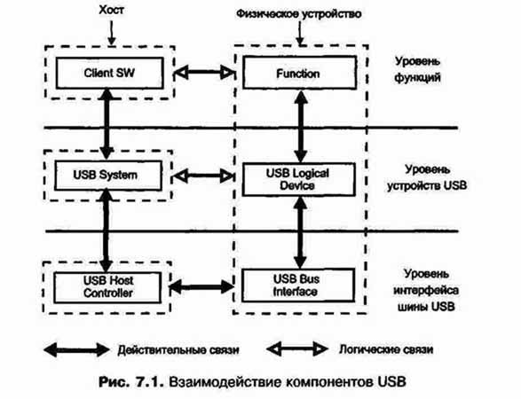 Система USB разделяется на три уровня с определенными правилами взаимодействия. Устройство USB содержит ин- терфейсную часть, часть устройства и функциональную часть. Хост тоже делится на три части - интерфейсную, си- стемную и ПО устройства. Каждая часть отвечает только за определенный круг задач, логическое и реальное взаимодей- ствие между ними иллюстрирует рис. 7.1. В рассматриваемую структуру входят следующие элементы: ^ Физическое устройство USB - устройство на шине, вы- полняющее функции, интересующие конечного пользо- вателя. ^ Client SW - ПО, соответствующее конкретному устрой- ству, исполняемое на хост-компьютере. Может являться составной частью ОС или специальным продуктом. ^ USB System SW - системная поддержка USB, независи- мая от конкретных устройств и клиентского ПО. ^ USB Host Controller - аппаратные и программные сред- ства для подключения устройств USB к хост-компьютеру. Физический интерфейс Стандарт USB определяет электрические и механические спе- цификации шины. Информационные сигналы и питающее напряжение 5 В пе- редаются по четырехпроводному кабелю. Используется диф- ференциальный способ передачи сигналов D+ и D- по двум проводам. Уровни сигналов передатчиков в статическом режиме должны быть ниже 0,3 В (низкий уровень) или выше 2,8 В (высокий уровень). Приемники выдерживают входное напряжение в пределах - 0,5...+3,8 В. Передатчики должны уметь переходить в высокоимпедансное состояние для дву- направленной полудуплексной передачи по одной паре про- водов. Передача по двум проводам в USB не ограничивается диф- ференциальными сигналами. Кроме дифференциального приемника каждое устройство имеет линейные приемники сигналов D+ и D-, а передатчики этих линий управляются индивидуально. Это позволяет различать более двух состояний линии, используемых для организации аппаратного ин- терфейса. Состояния DiffO и Diff1 определяются по разно- сти потенциалов на линиях D+ и D- более 200 мВ при условии, что на одной из них потенциал выше порога сраба- тывания VSE. Состояние, при котором на обоих входах D+ и D- присутствует низкий уровень, называется линейным ну- лем (SEO - Single-Ended Zero). Интерфейс определяет следу- ющие состояния: йа DataJ State и Data К State - состояния передаваемого бита (или просто J и К), определяются через состояния DiffO и Diff1. ^ Idle State - пауза на шине. ^ Resume State - сигнал "пробуждения" для вывода устрой- ства из "спящего" режима. ^ Start of Packet (SOP) - начало пакета (переход из Idle State в К). т End of Packet (EOP) - конец пакета. ^ Disconnect - устройство отключено от порта. ^ Connect - устройство подключено к порту. ^ Reset - сброс устройства. Состояния определяются сочетаниями дифференциальных и линейных сигналов; для полной и низкой скоростей состояния DiffO и Diff1 имеют противоположное назначение. В декодировании состояний Disconnect, Connect и Reset учитывается время нахождения линий (более 2,5 мс) в определенных состояниях. Шина имеет два режима передачи. Полная скорость передачи сигналов USB составляет 12 Мбит/с, низкая - 1,5 Мбит/с. Для полной скорости используется экранированная витая пара с импедансом 90 Ом и длиной сегмента до 5 м, для низкой -невитой неэкранированньгй кабель до 3 м. Низкоскоростные кабели и устройства дешевле высокоскоростных. Одна и та же система может одновременно использовать оба режима; переключение для устройств осуществляется прозрачно. Низкая скорость предназначена для работы с небольшим количеством ПУ, н