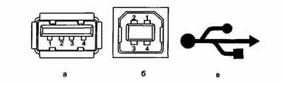 Разъемы типа "А" применяются для подключения к хабам (Upstream Connector). Вилки устанавливаются на кабелях, не отсоединяемых от устройств (например, клавиатура, мышь и т. п.). Гнезда устанавливаются на нисходящих портах (Downstream Port) хабов. Разъемы типа "В" (Downstream Connector) устанавливаются на устройствах, от которых соединительный кабель может отсоединяться (принтеры и сканеры). Ответная часть (вилка) устанавливается на соединительном кабеле, противополож- ный конец которого имеет вилку типа "А". Разъемы типов "А" и "В" различаются механически (рис. 7.5), что исключает недопустимые петлевые соедине- ния портов хабов. Четырехконтактные разъемы имеют ключи, исключающие неправильное присоединение. Конструкция разъемов обеспечивает позднее соединение и раннее отсоединение сигнальных цепей по сравнению с питающими. Для распознавания разъема USB на корпусе устройства ставится стандартное символическое обозначение.