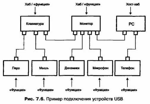 Рис. 7.5. Гнезда USB: а - типа "А", б - типа "В", в - символическое обозначение Питание устройств USB возможно от кабеля (Bus-Powered Devices) или от собственного блока питания (Self-Powered Devices). Хост обеспечивает питанием непосредственно подключенные к нему ПУ. Каждый хаб, в свою очередь, обеспе- чивает питание устройств, подключенных к его нисходящим портам. При некоторых ограничениях топологии допускается применение хабов, питающихся от шины. На рис. 7.6 приведен пример схемы соединения устройств USB. Здесь клавиатура, перо и мышь могут питаться от шины.
