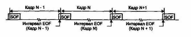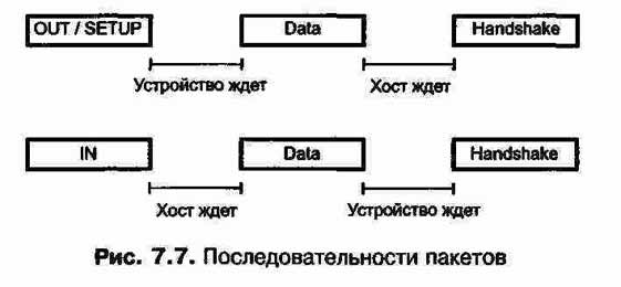 В пакетах-маркерах IN, SETUP и OUT следующими являются адресные поля: 7-битный адрес функции и 4-битный адрес конечной точки. Они позволяют адресовать до 127 функций USB (нулевой адрес используется для конфигурирования) и по 16 конечных точек в каждой функции. В пакете SOF имеется 11-битное поле номера кадра (Frame Number Field), последовательно (циклически) увеличиваемое для очередного кадра. Поле данных может иметь размер от 0 до 1023 целых байт. Размер поля зависит от типа передачи и согласуется при установлении канала. Поле СКС-кола присутствует во всех маркерах и пакетах дан- ных, оно защищает все поля пакета, исключая PID. CRC для маркеров (5 бит) и данных (11 бит) подсчитываются по раз- ным формулам. Каждая транзакция инициируется хост-контроллером посыл- кой маркера и завершается пакетом квитирования. После- довательность пакетов в транзакциях иллюстрирует рис. 7.7. Хост-контроллер организует обмены с устройствами согласно своему плану распределения ресурсов. Контроллер цикли- чески (с периодом 1 мс) формирует кадры (Frames), в кото- рые укладываются все запланированные транзакции. Каж- дый кадр начинается с посылки маркера SOF (Start Of Frame), который является синхронизирующим сигналом для всех устройств, включая хабы. В конце каждого кадра выделяет- ся интервал времени EOF (End Of Frame), на время которого хабы запрещают передачу по направлению к контроллеру. Каждый кадр имеет свой номер. Хост-контроллер опериру- ет 32-битным счетчиком, но в маркере SOF передает только младшие 11 бит. Номер кадра увеличивается (циклически) во время EOF. Хост планирует загрузку кадров так, чтобы в них всегда находилось место для транзакций управления и прерывания. Свободное время кадров может заполняться сплошными передачами (Bulk Transfers).
