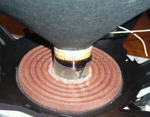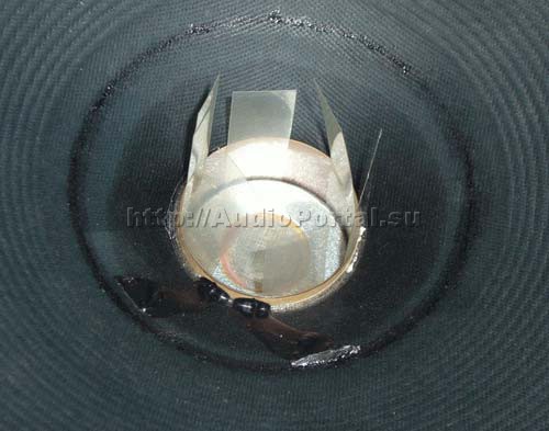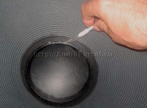Сборка динамика производится в обратном порядке. Сначала следует максимально точно установить диффузор на свое старое место. Хорошими «направляющими» при этом служат остатки старого клеевого шва – их следует совместить с «отпечатками» на смежной поверхности. В том случае, если при разборке динамика не удалось отклеить центральный подвес от корзины, и пришлось «выгрызать» катушку, то на тканевой основе центрального подвеса наверняка останутся жесткие остатки клеевого шва, которые могут повредить обмотку звуковой катушки при сборке. Для исключения этого следует вставлять катушку в центральный подвес по направляющим. Можно попробовать свернуть направляющее кольцо из тонкого пластика, и вставить его внутрь центрального подвеса, и даже в магнитный зазор, и уже потом вставлять на место звуковую катушку.