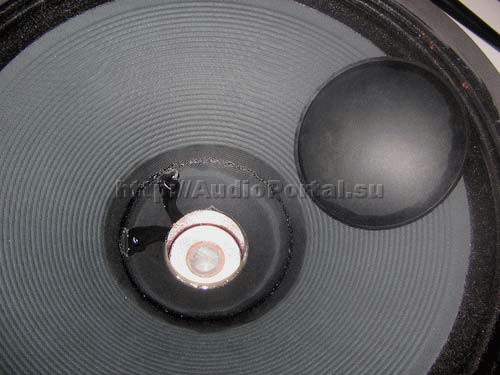 Следующий этап – демонтаж пылезащитного колпачка диффузора. На его месте (или вместе с ним) может оказаться ВЧ-рупор широкополосника, который при необходимости так же демонтируется. Перед отклеиванием колпачка его аккуратно по всему диаметру смачивают каким-либо растворителем, для размягчения клея. Какой именно растворитель следует использовать для этого, сказать не возможно – разновидность клеевых составов, применяемых при сборке динамиков очень велика, поэтому выбор конкретного типа растворителя приходится осуществлять в процессе работы. Учитывая, что раньше большинство производителей динамиков применяло клеи или на спиртовой основе, или нитроцеллюлозные, то начинать следует именно со спирта (не с водки – она плохой растворитель), ацетона, или растворителей типа 646, 648 (предпочтение следует отдавать именно растворителям – они менее летучи, чем ацетон). Иногда приходится использовать толуол или дихлорэтан, только нужно иметь в виду их токсичность и летучесть, следствием которой является существенно больший расход. Разумеется, используя любой растворитель, следует позаботиться о вытяжке, или хорошей вентиляции, и соблюдать все меры предосторожности, исключая попадание любого растворителя на слизистые оболочки носа, рта и особенно – глаз. Если же такое произошло, необходимо промыть глаза большим количеством холодной воды, и незамедлительно обратиться к врачу. Можно попробовать смешать разные типы растворителей, для получения универсального «размягчителя» клея. Наносить растворитель следует непосредственно на место склейки, исключая его растекание по поверхности диффузора. Делать это следует при помощи маленького одноразового шприца с затупленной иглой.