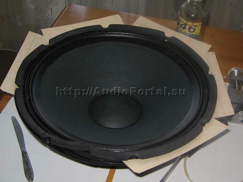 При установке диффузора в корзину нужно обеспечить как абсолютную аксиальность катушки относительно магнитного зазора, так и выдержать ее высоту относительно фланца. Только после этого можно приклеивать (или скручивать) центральный подвес и загофровую юбку диффузора. Для приклеивания центрального подвеса и юбки гофра можно использовать резиноподобные клеи – 88, «Момент», и т.д. Я же обычно применяю импортные сапожные клеи, которыми со мной делится ближайший сапожник. Положительным свойством сапожных клеев является то, что они наносятся на склеиваемые поверхности и высушиваю заранее (примерно за полчаса-час до склейки), и к началу сборки уже не пристают к рукам, а в момент склеивания поверхности просто прогреваются термофеном, и сжимаются на несколько секунд. После этого полоски, центрующие звуковую катушку, извлекаются из магнитного зазора, точность установки диффузора проверяется путем аккуратного перемещения диффузора вверх-вниз. Это следует делать, не перекашивая диффузор, т.е. усилие, прилагаемое к диффузору должно быть симметрично относительно его оси. В течение нескольких часов после склеивания (этого вполне хватает для проверки собранного динамика) такое соединение может быть довольно легко разобрано повторным нагревом, без размачивания клея, для устранения возможных неточности установки диффузора и центровки звуковой катушки. В последнюю очередь приклеивается на место пылезащитный колпачок, а тоководы припаиваются к колодке на корзине динамика (разумеется, с соблюдением описанных выше предосторожностей). Собранный динамик проверяется сначала на малой, а затем на максимальной мощности, и при отсутствии посторонних призвуков, монтируется обратно в акустическую систему.