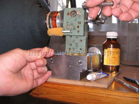 На фотографии виден вращающийся на тонкой стальной оси поролоновый валик, который непосредственно перед началом намотки обильно пропитывается клеем. Валик я делаю из кусочка поролона, одетого на обрезок стержня от авторучки. Провод перед укладкой на каркас касается пропитанного клеем поролона, и попадает на него (каркас) уже вымазанный клеем. Это несложное приспособление существенно улучшает проклейку катушки. Провод при намотке тоже обезжиривается - на фото этого не видно (сфотографировано до начала работы, там и валик еще не пропитан клеем), но обычно я держу провод салфеткой, смоченной в том же изопропиловом спирте.