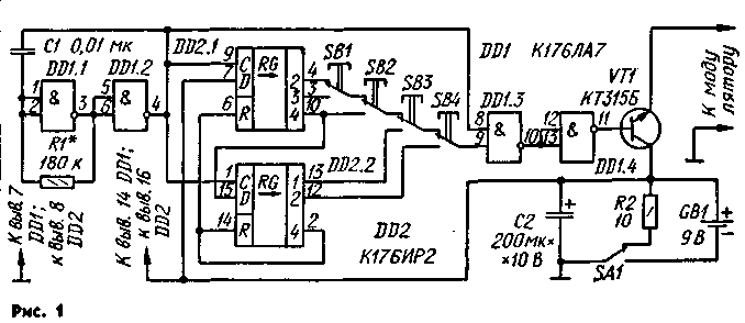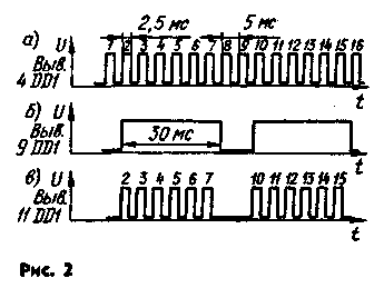 регистров DD2.1 и DD2.2 и на верхний по схеме вход элемента DD1.3. Если командные кнопки SB1—SB4 находятся в положении, показанном на схеме, то на нижнем входе этого элемента будут появляться импульсы длительностью 30 мс (рис. 2, б). На выходе инвертора DD1.4 будут сформированы группы импульсов, разделенные паузой (рис. 2, в). На время действия импульса транзистор VT) открывается, и напряжение от источника питания GB1 поступает на модулятор передатчика. При выключении питания переключателем SA1 конденсатор С2 через резистор R2 быстро разряжается. Если его не разряжать, то при выключении питания напряжение на нем станет убывать медленно и антенна передатчика некоторое время будет излучать в пространство не командные группы, а последовательность импульсов тактового генератора. Работа дешифратора будет нарушена. Как формируются группы импульсов остальных команд, легко понять, рассмотрев таблицу.
