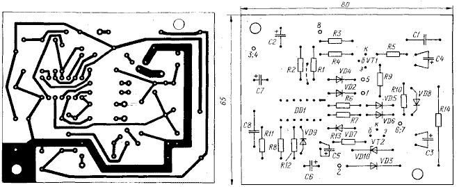 входе инвертора DD1.1. Детали автосторожа смонтированы на печатной плате из фольгированного стеклотекстолита толщиной 1,5 мм. Чертеж платы показан на рис. 2. В устройстве применены резисторы МЛТ, С2-33. Конденсаторы К50-16, К50-35 (оксидные), КМ-6, К73-17 (остальные). Применение оксидньк конденсаторов К50-6 крайне нежелательно из-за их большого тока утечки и слишком малой надежности.