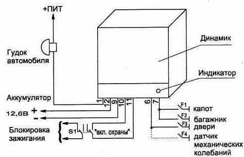 Рис. 1. Подключение системы охраны к автомобилю При охране автомобиля устройство работает с двумя типами внешних датчиков: а) для дверей (датчики открывания дверей или датчик механических колебаний, см. статью "Датчики для охранной сигнализации") — включает звуковой сигнал с задержкой 6 секунд; б) для закрытого капота и багажника — мгновенное включение звукового сигнала. Владелец автосторожа при срабатывании сигнализации по звуку легко может определить группу датчиков, сработавших во время охраны. Схема автосторожа обеспечивает после включения охраны задержку 12±2 секунд для выхода из машины и 6±1 секунд при входе в автомобиль для отключения сигнализации скрытно установленным тумблером S1 до срабатывания звукового сигнала.