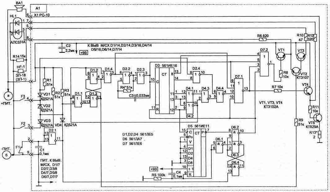 Рис. 3.5. Усовершенствованная схема охранной сигнализации Для выполнения всех этих функций в схему (рис. 3.5) добавлены узлы: ограничителя времени звучания звукового сигнала на счетчике D5; триггера на элементах D6 для обеспечения режима ожидания начала отсчета временного интервала 12 секунд. Светодиод HL1 и пьезоизлучатель HF1 позволяют более полно контролировать режимы работы устройства, что удобно при эксплуатации. В начальный момент включения питания схемы (А1) импульс, сформированный цепью C4-R5, обеспечивает обнуление счетчика D5 (на выходе D5/7 появится логическая "1", т. е. напряжение питания). При этом на выводах элементов схемы будут состояния: D6/10 — лог. "1"; D1/1 — "0"; D1/2 — "0"; D1/3 ~ "1"; D7/1 — "О"; D7/13 — "0". После срабатывания датчика F1 на выводе D6/9 появится лог. "1" (D6/10 — "О"), что приведет к появлению на выходе D1/3 лог. "О". Начнет работать генератор и связанный с ним счетчик D3, до момента времени (12 секунд), пока на D4/10 не появится лог. "О" (на D1/3 —лог. "1", что остановит работу генератора). При этом схема переходит в режим ОХРАНА и будет находиться в таком состоянии, пока не сработает любой датчик. Если сработает один из датчиков F1 или F2 (когда схема находится в режиме ОХРАНА), это приведет к переключению триггера на элементах D1.1...D1.3 (на выводе D1/4 появится лог. "1", а на выводе D1/3 — "О"), что включит работу генератора и счетчика D3. В этом случае через 6 секунд появится звуковой сигнал оповещения (ВА1). За этот интервал времени необходимо отключить блок охраны, что, не зная места расположения тумблера SA1, сделать постороннему невозможно. При срабатывании датчика F3 звуковой сигнал появится без задержки. Когда блок охраны работает в режиме ОПОВЕЩЕНИЕ, кроме звукового сигнала, будет красным цветом светиться индикатор HL1. Сдвоенный светодиод HL1 можно заменить двумя любыми обычными светодиодами с разным цветом свечения. Для того чтобы снизить ток потребления схемой при работе светодиода в режиме индикации, напряжение на него подается импульсами. Из-за инерции зрения это незаметно.