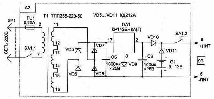 Рис. 3.6. Блок питания В стационарных условиях лучше, если устройство будет иметь смешанное питание — от сети и аккумулятора. При этом, основным является сетевой источник, а в аварийной ситуации (при отключении сети) автоматически подается резервное питание от аккумулятора (рис. 3.6). В качестве датчиков F1...F3 для сигнализации удобно использовать герконовые контакты, например КЭМ-1, совместно с магнитом. Они малогабаритны и имеют высокую надежность. Чаще всего бывает достаточно всего одного датчика (F1) на входной двери. В случае кратковременного срабатывания датчиков схема из режима ОПОВЕЩЕНИЕ автоматически возвращается в режим ОХРАНА. Длительность звучания сигнала оповещения зависит от того, какой датчик сработал, и по звуку можно легко определить группу сработавших датчиков. Применяемые резисторы, конденсаторы и пьезоизлучатель (HF1) по дойдут любого типа, малогабаритные. Вместо транзисторов КТ3102 можно применить КТ315Г(Е), КТ3107 заменяется на КТ361Г(Е). Транзистор VT5 и стабилизатор DA1 крепятся на теплорассеивающих пластинах. В качестве диодов VD1...VD4 подойдут любые импульсные, VD5... VD11 заменяются на КД213А или аналогичные. Для сетевого блока питания трансформатор Т1 можно использовать с напряжением во вторичной обмотке 12...16 В и мощностью не менее 15 Вт. Так, например, подойдут унифицированные трансформаторы типа: ТПП266- 220-50, ТПП276-220-50, ТПП286-220-50. В этом случае, при монтаже, сохраняется нумерация выводов, указанная на схеме (рис. 3.13). Блок охраны размещается в скрытом месте, а соединения с датчиками лучше выполнять перевитыми между собой проводами, что исключит влияние внешних наводимых помех. При правильной сборке и исправных деталях схема начинает работать сразу и настройки, как правило, не требует. При необходимости временные интервалы 6 и 12 секунд можно одновременно изменить подбором номинала резистора R4. Резистор R13 позволяет ограничить мощность звука в динамике.