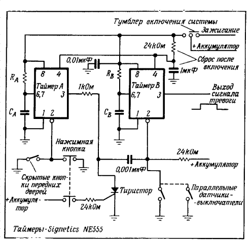 Интегральный таймер А дает выдержку, необходимую для того, чтобы водитель, садясь в машину, успел выключить противоугонную систему. Благодаря этому исключается необходимость во внешнем выключателе системы. Тиристор предотвращает срабатывание таймера В иначе как от датчиков-выключателей, расположенных в уязвимых точках машины. Таймер А выполняет двойную функцию — обеспечивает время выдержки (оно примерно равно 1,1 RaCa), достаточное не только для того, чтобы водитель, включив противоугонную систему, успел выйти из машины, но также и для того, чтобы он, сев в машину, успел выключить систему. Благодаря этому времени выдержки исключается необходимость устанавливать вне салона машины специальный выключатель, что всегда неудобно, не говоря уж о том, что злоумышленник всегда может обнаружить этот выключатель, В данном случае тумблер для включения и выключения системы можно спрятать где-нибудь за приборным щитком машины. Когда система выключается, то спадом выходного импульса таймера А запускается таймер В. Когда же система включена, то тиристор позволяет запустить таймер В не иначе как от срабатывания одного из датчиков — выключателей заземляющего типа, расположенных в уязвимых точках машины.