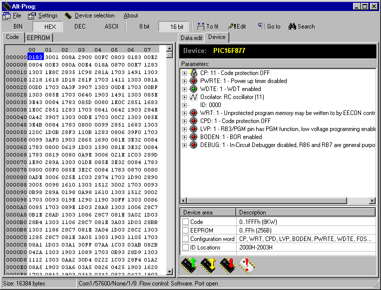 0..3Fh (64B) Area_2_Data=EEPROM,0,$3F,8 Area_3_Content=Configuration word | CP, PWRTE, WDTE, FOSC Area_3_Data=CONFIG,$2007,$2007,14 Area_4_Content=ID Locations | 2000H-2003H Area_4_Data=ID,$2000,$2003,8 |