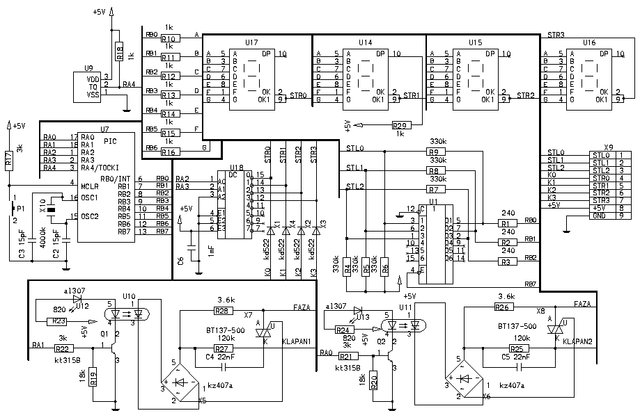 Рис.1. Схема программируемого стабилизатораДетали: U1 - К561ЛН1, U18 - К1533ИД7, U7 - PIC16F84-04I/P, U9 - DS1820, U10,U11 - АОУ115В, U17,U14,U15,U16 - HD1077G. Температурный датчик U9 измеряет температуру и передает ее в микроконтроллер U7, который выводит ее на четырехразрядный индикатор на U14-U17, управляет двумя мощными ключами на X7,X8. Ключи гальванически развязаны от остальной схемы с помощью U10,U11. Светодиоды U12,U13 загораются при открытых ключах. Третьей задачей микроконтроллера является опрос клавиатуры, подключаемой через разъем X9. Схема позволяет использовать стандартную телефонную клавиатуру 4*3 клавиши, но программно поддерживается только один ее столбец (STL0), т.е. 4 кнопки. Их достаточно для выполняемых функций. Для сканирования клавиатуры используются импульсы динамической индикации, которые, пройдя через нажатую клавишу, усиливаются усилителем U1, и, это особенность данной схемы, принимаются по тому порту, куда выдаются (RB0 для STL0) данные разрядов индикатора. Во время, когда опрос клавиатуры не производится, выходы усилителя переводятся в Z-состояние, для чего используется порт RB7. Резисторы R1-R3 - защитные. Напряжение сети 220В подается на общий для ключей вывод FAZA, и на клапана или двигатель, которые другими выводами соединяются с KLAPAN1 и KLAPAN2. Для наиболее точной стабилизации температуры в программном управлении ключами заложены следующие принципы: 1. Ключ X7 предназначен для увеличения температуры, X8 - для уменьшения. При несовпадении температуры с требуемой производится выбор нужного ключа и он открывается на программируемое время открытия, затем, в течение тоже программируемого времени установления, при закрытом ключе температура измеряется и снова производится выбор ключа. Таким образом, в режиме стабилизации можно выделить периоды, состоящие из времени открытия и времени установления. 2. При решении открыть соответствующий ключ учитывается приращение или уменьшение температуры, полученное при предыдущих измерениях. Для устранения эффекта перерегуляции рассчитывается время, прошедшее с момента перехода через требуемую температуру до момента, когда температура минимальна или максимальна и используется для определения момента, когда нужно открывать или закрывать заслонку. 3. Режим стабилизации может отключаться с клавиатуры. При его отключении производится закрытие заслонки путем включения уменьшающего ключа на несколько секунд. 4. С клавиатуры вводятся и запоминаются в постоянной памяти требуемая температура, время открытия и время установления. Температурный датчик DS1820 передает в микроконтроллер уже обработанную температуру в цифровом последовательном коде по однопроводному интерфейсу. Длина соединительных проводов между датчиком и устройством может достигать 10 - 15 метров и не влияет на точность измерения. Более подробную информацию об этой микросхеме можно получить на сайте фирмы Dallas Semiconductor (http://www.dalsemi.com). А текст подпрограммы, используемой в термостабилизаторе для получения температуры (работы с датчиком), можно посмотреть здесь: "sensor.rar"Документация (Datashit) на МК PIC16F84 Желаю творческих успехов. С уважением, Владимир Шашин.