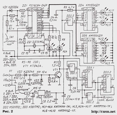 Сформированная импульсная последовательность поступает на вход RB0 процессора DD1, который обрабатывает ее по встроенной программе с использованием прерываний. Требуемый вид измерения выбирают тумблером SА1, изменяющим режим входа RB1 процессора.