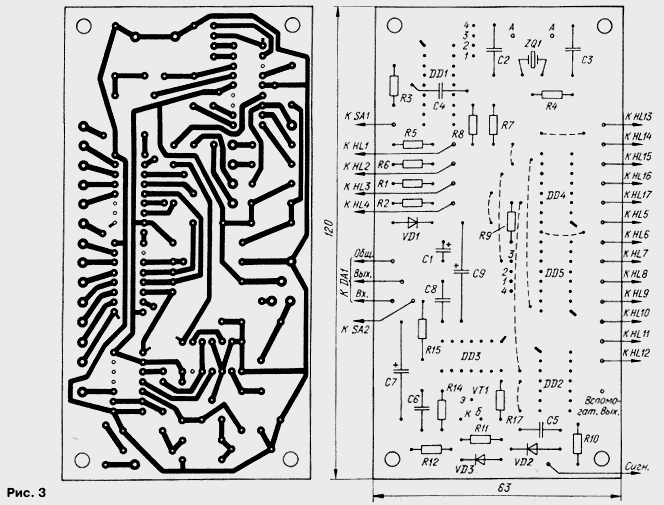 Детали тахометра, за исключением светодиодов, тумблеров и стабилизатора DA1, смонтированы на печатной плате, чертеж которой изображен на рис. 3.