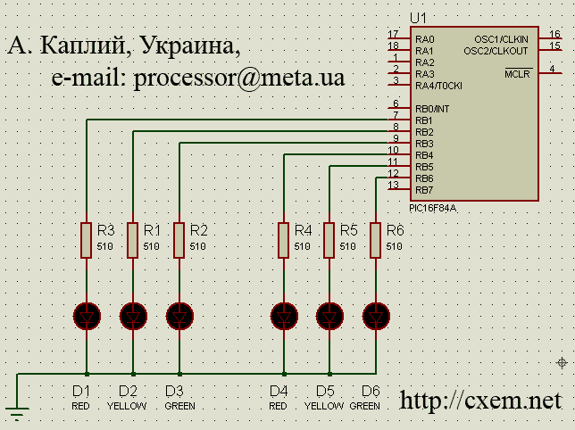 Светодиоды подключаются к выводам RB1..RB6 через токоограничительные