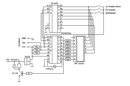 Управление осуществляется тремя клавишами «Установка», «Больше», «Меньше». Терморегулятор индицирует текущую температуру от -30 до +80 градусов Цельсия, с точностью 1 градус. Документация (Datashit) на МК PIC16F84A Прошивку HEX вы можете скачать здесь (2 кБайт) . Пишите: 2428104 [собака] rambler.ru