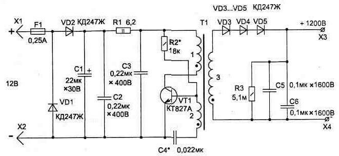 Устройство предназначено для активной защиты металлической двери квартиры или сейфа и может быть. применено совместно с другими охранными устройствами как дополнительное, включаемое в случае тревоги. Оно может пригодиться также и в сельском хозяйстве для создания электрического ограждения огорода от животных (для этого достаточно установить по периметру колья с натянутыми двумя оголенными проводами). Рис. 3.16. Электрическая схема "ЕЖИКА" Схема устройства (рис. 3.16) состоит из автогенератора на транзисторе VT1 и трансформаторе Т1, с высоковольтной обмотки которого после выпрямления на диодах VD3...VD5 снимается напряжение 1000...1200 В. Это позволяет при прикосновении к любому из высоковольтных выводов получить удар током, сила которого будет зависеть от общей емкости конденсаторов С5 и С6 (энергия запасенного заряда на емкости: Uc — напряжение на конденсаторе в вольтах, С — суммарная емкость в фарадах), а их величина выбрана такой, чтобы этот удар не представлял опасности для жизни, однако второй раз его получать уже не захотелось. Для изготовления электрического "ЕЖИКА" потребуется намотать трансформатор Т1 на диэлектрическом каркасе, вставляемом в броневой сердечник БЗО (см. рис. 3.17) из феррита М2000НМ1 (М1500НМ1). Трансформатор содержит в обмотке 1 — 9 витков, 2 — 10 витков провода ПЭЛШО-0,18, в обмотке 3 — 1800 витков провода ПЭЛ-0,1. Его изготовление требует аккуратности, и при намотке 3-й обмотки необходимо через каждые 400 витков укладывать конденсаторную диэлектрическую бумагу (ее можно достать из высоковольного конденсатора), а слои пропитать конденсаторным или трансформаторным маслом. После намотки катушки вставляем ее в ферритовые чашки и склеиваем (предварительно убедившись, что она работает). Места выводов катушки заливаются разогретым парафином.