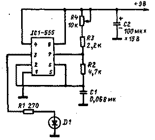 Работа схемы. Начнем со светового передатчика на рис.1. На таймере типа 555 собран автогенератор, работающий на частоте 1500 Гц. К его выходу подключен инфракрасный светодиод, пульсирующий с частотой генератора. Частота генератора определяется номиналами резисторов R2, R3, R4 и конденсатора C1. Переменным резистором R4 производится точная настройка передатчика на частоту фотоприемника. Конкретная рабочая частота преемника не столь важна, так как под нее легко подстроить частоту фотопередатчика. Резистор R1 ограничивает ток через светодиод. Уменьшив его, можно увеличить световой выход светодио-да, но перед этим необходимо убедиться, но ток через светодиод не превышает максимально допустимый. Фотоприемник, схема которого показана на рис.2, немного сложнее по сравнению с простой схемой фотопередатчика, но на самом деле тоже относится к простым схемам.
