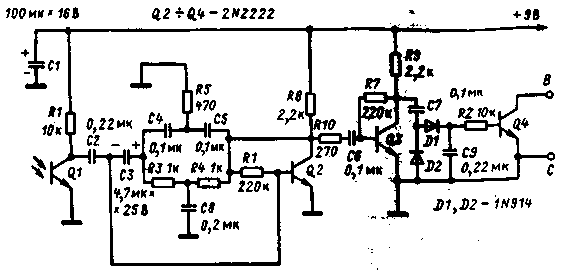 Детектор инфракрасного света транзистор Ql (Radio Shack 276-142) воспринимает пульсирующий луч от фотопередатчика и перелает небольшой по амплитуде сигнал переменного напряжения в схему на двойной Т-мост. Если взглянуть повнимательнее, то видно, что вход и выход Т-моста подключены к базе и коллектору транзистора Q2. Весь комплекс образует резонансный усилитель, максимум усиления Которого приходится на резонансную частоту. На этой частоте сопротивление Т-моста максимальное, я поэтому минимальна наводимая через него отрицательная обратная связь. Благодаря этому свойству транзистор Q2 усиливает только сигнал с частотой 1500 Гц, поступающий от фотопередатчика. Дальше сигнал с частотой 1500 Гц усиливается транзистором Q3 до уровня, достаточного для работы детектора с удвоением напряжения на диодах D1 и D2. Постоянное напряжение с его выхода через резистор R2 открывает транзистор Q4, замыкавший через себя клеммы В и С.