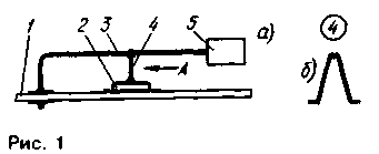 Основой датчика служит пьезоэлемент от звукоизлучателя ЗП-2, ЗП-4 или ЗП-5. Общий вид датчика (сбоку) показан на рис.1,а. Пьезоэлемент 2 одной из обкладок припаян к фолымрованной площадке печатной платы 1. К верхней по рисунку обкладке пьезоэлемента 2 припаивают стойку 4, согнутую в виде буквы Л из упругой стальной проволоки диаметром 0,5 мм. Вид на стойку 4 по стрелке А показан на рис. 1,6. Лапы и седловину стойки нужно заранее облудить. Консоль 3 выгибают из такой же проволоки и надежно укрепляют на одном из ее концов груз 5 массой 10...15 г из свинца или припоя. После этого консоль припаивают одним концом к плате, а примерно серединой - к седловине стойки 4. Во избежание отрыва верхней обкладки от пьезоэлемента перед припайкой консоли ее слегка изгибают так, чтобы после установки на место она создавала на пьезоэлементе избыточное прижимающее упругое усилие. Размеры деталей датчика непринципиальны, поэтому на рис.1 не даны. Паять необходимо легкоплавким припоем. Выводами датчика служат фольговая площадка, к которой припаян пьезоэлемент, и впаянное в плату основание консоли. Плату укрепляют на поверхности,