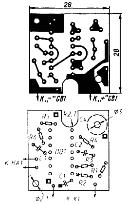 Печатная плата устройства показана на рис. 84. Ее изготавливают из двустороннего фольгированного стеклотекстолита толщиной 1 мм. Фольгу со стороны деталей используют лишь в качестве нулевой шины (с ней соединен «-» GB1), в местах пропуска проводников она имеет выборки - кружки диаметром 1,5...2 мм (на рисунке не показаны).