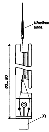 Шлейфный датчик представляет собой сложенный вдвое обмоточный провод ПЭВ-2 или ПЭВ-3 диаметром 0,07...0,1 мм нужной длины с половинкой двухполюсного разъема на конце. Шлейф хранят намотанным на челнок-мотовильце. Разъем и мотовильце могут быть конструктивно объединены, так, например, как показано на рис. 85. Здесь XI - разъем от микрокалькулятора. Ответная его часть может быть смонтирована непосредственно на корпусе «сторожа», но лучше ее вынести на механически прочном двухпроводном шнуре (удобен покрытый пластиком тонкий экранированный провод), что позволит соответственно укоротить сам шлейф.