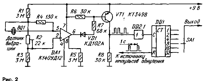 литель DA1 работает в режиме максимального усиления, а транзистор VT1 - в режиме переключения. Диод VD1 увеличивает своим напряжением отсечки зону нечувствительности транзистора. ОУ вместе с диодом и транзистором образуют компаратор напряжения, отличающийся малым энергопотреблением. Порог срабатывания компаратора устанавливают подстроечным резистором R2. Если амплитуда отрицательной полуволны сигнала датчика менее напряжения на резисторе R2, транзистор VT1 остается закрытым, а выходное напряжениеравным нулю. Механическое возбуждение датчика приводит к появлению на выходе формирователя нескольких прямоугольных импульсов длительностью 3...15 мс, по амплитуде пригодных для прямого введения их в цифровой анализатор, выполненный на микросхемах КМОП. Простейшее подобное устройство, способное выделить полезный сигнал на фоне ложных срабатываний, представляет собой счетчик(001 на рис.2), периодически обнуляемый по входу R импульсами электронных часов или специального генератора. Сигнал тревоги - напряжение высокого уровня - появится на выходе лишь тогда, когда число импульсов на входе счетчика в интервале между двумя соседними обнуляющими импульсами достигнет некоторого числа, устанавливаемого переключателем SA1 (на рис.2 оно установлено равным восьми). Если не задаваться решением задачи исключения ложных сигналов, то сигнал с коллектора транзистора VT1 можно подавать непосредственно на вход узла формирования сигнала тревоги. Как показывает опыт, датчик практически не реагирует на акустические сигналы, распространяющиеся в воздушной среде. Чувствительный прежде всего к нормальной составляющей вибраций, он довольно хорошо воспринимает и возмущения, лежащие в плоскости пьезоэле-мента,-очевидно вследствие возникновения реакции в точках крепления стойки. Таким образом, датчик реагирует на вибрации произвольной ориентации. Ток, потребляемый усилителем-формирователем в режиме ожидания при напряжении питания 9 В, не превышает -18 мкА, при 5 В - 10 мкА. Ю.ВИНОГРАДОВ, г.Москва (РАДИО 12/94)