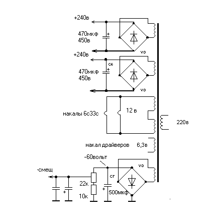 Рис. 2. Блок питания усилителя на лампе 6с33с (6с18с) Усилитель собран по традиции в корпусе Прибоя. В качестве драйвера использовал 6ж52п. Их нужно отобрать с минимальным микрофонным эффектом. Коэффициент усиления драйвера 48. Накал 6С33С (6С33С) переменным током 12 вольт. На накал обоих ламп подается через делитель +30 вольт. Блок питания у Прибоя –ум75 имеет две вторичные обмотки на 240 вольт включенные последовательно. Их нужно использовать как два источника питания отдельно для каждого канала. При использовании выходных трансов Прибоя в них необходимо установить немагнитную прокладку. Я использовал принтерную бумагу в три слоя. Первичная обмотка соединяется параллельно. Лучше выходные трансы перемотать более толстым проводом. Например как у Стародубцева или А.Торреса. Получаем 10 ватт (до начала ограничения) при входном напряжении 1 вольт. При использовании драйвером 6Э5П в тетродном включении чувствительность усилителя 0,5 вольт. Номиналы конденсаторов указаны минимальные. Увеличение их емкости приветствуется.