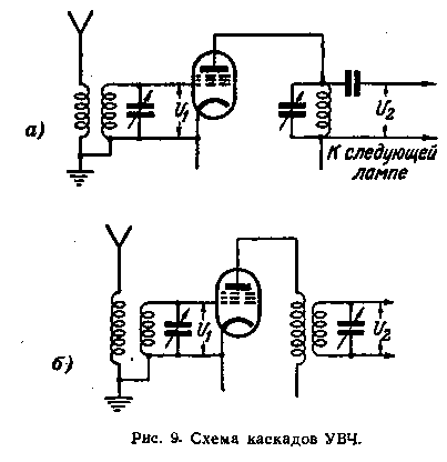 Каскад усиления высокой частоты (УВЧ); вводится, как правило, только в приемниках 1-го класса. Лишь в виде исключения он встречается и в приемниках 2-го класса. В УВЧ обычно применяется схема (рис. 9) резонансного усиления с .настроенным контуром, включенным в анодную цепь лампы либо непосредственно