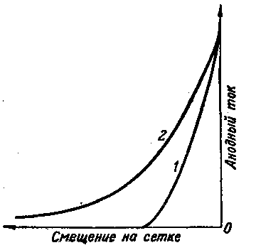 Рис. 10. Характеристика лампы. 1 — короткая; 2 — удлиненная. кроме того, нелинейные искажения, которые могут возникнуть при приеме сигналов мощных станций из-за перегрузки лампы. УВЧ служит для повышения чувствительности и лучшего подавления помех по зеркальному каналу. Введение каскада усиления по высокой частоте увеличивает число настроенных контуров. Поэтому резонансная характеристика высокочастотной части приемника улучшается и, следовательно, повышается эффективность подавления помех. Кроме того, установлено, что наибольшие собственные шумы возникают в преобразовательной лампе, где они в несколько раз выше, чем у обычной усилительной лампы, и могут составить заметную величину по сравнению с напряжением сигнала. Если колебания на сетку лампы преобразователя попадают не прямо из антенны, а после некоторого усиления, то естественно, что отношение сигнал/шум улучшается.