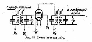 Усилитель промежуточной частоты (УПЧ) в большинстве приемников бывает однокаскадным (рис. 15); в приемниках 1-го класса и, как исключение, в некоторых приемниках 2-го класса применяются двухкаскадные УПЧ. В каскадах УПЧ используются обычно высокочастотные пентоды с удлиненной характеристикой, позволяющие регулировать усиление в широких пределах путем изменения смещения на управляющей сетке. Величина напряжения смещения автоматически регулируется системой АРУ с таким расчетом, чтобы напряжение на выходе усилителя промежуточной частоты оставалось более или менее одинаковым при приеме сигналов различных станций, как сильных, так и слабых. В анодную цепь лампы включается второй фильтр промежуточной частоты. Контуры настраиваются сердечниками из альсифера, карбонильного железа или феррита. Емкость конденсаторов, в контурах промежуточной частоты выбирают не меньше 120—180 пф, для того чтобы смена ламп не приводила к заметной расстройка контуров. ![]() В некоторых приемниках предусматривается возможность изменения степени связи между контурами одного или обоих фильтров для регулировки полосы пропускания по промежуточной частоте. Для этого используются два основных способа: 1) увеличение связи между первичной и вторичной цепями путем включения дополнительной катушки связи, состоящей из нескольких витков; 2.) перемещение одной из катушек и изменение ее положения относительно второй катушки, осуществляемые механическим путем при помощи специальной тяги.