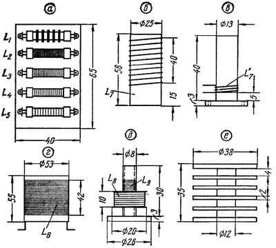 триода Л3, работающего в оконечном каскаде УНЧ. Для ослабления различных интерференционных свистов и помех от близко расположенных по частоте станций, мешающих приему телеграфных сигналов, в цепь управляющей сетки выходного каскада переключателем П2 включается низкочастотный фильтр Др1С29С30С31. Собственная частота этого фильтра - 1200 Гц при ширине полосы пропускания около 150 Гц. Под действием этого фильтра на управляющей сетке лампы выходного каскада выделяются напряжения только тех телеграфных сигналов, которые имеют частоту биения порядка 1200 Гц. Все остальные сигналы резко ослабляются и на выходе приемника не прослушиваются. Детали и конструкция Почти все детали приемника самодельные. Катушки L2-L5 имеют рядову намотку на каркасах от сопротивлений ВС-1, с которых наждачной бумагой снимается проводящий слой (рис.3а).