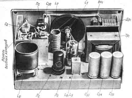 Рис.4. Вид шасси собранного приемника Налаживание приемника После проверки правильности монтажа и исправности блока питания необходимо установить режимы работы ламп, указанные на принципиальной схеме. Усилитель НЧ. Для проверки всей низкочастотной части необходимо установить П1 в положение, указанное на принципиальной схеме. R6 - на минимальное усиление. R10 - на минимальную обратную связь. Включить телефоны и прикоснуться отверткой к управляющей сетке Л3/1. При этом в телефоне должен прослушиваться сильный фон. Для проверки качества звучания нужно подать на вход (параллельно R8) какой-либо НЧ сигнал (с выхода любого вещательного приемника либо трансляционной сети). При наличии искажений подобрать R12. Детектор и УПЧ. При исправном детекторе при повороте ручки R10 на 30...50 градусов должны возникнуть собственные колебания. В телефонах слышен характерный щелчок. При отсутствии колебаний нужно поменять местами концы L9. Для плавного возникновения генерации необходимо подобрать данные R8C27 и числа витков L9. Регулировка усилителя ПЧ при нормальном режиме лампы Л2 сводится к настройке контура L8C24 на выбранную частоту с помощью сигнал-генератора (СГ) настроенного на частоту 1600 кГц с включенной внутренней модуляцией. Для этого сигнал с выхода СГ через конденсатор 200 пФ подают на Л2/4, от которой отсоединяется С13. Через разделительный конденсатор 0,1 мкФ, параллельно телефонам, подключают авометр для измерения переменных напряжений. Во избежания паразитных свистов при настройке следует установить минимальную обратную связь (R10) и сорвать колебания гетеродина параллельным включением к контуру конденсатора 0,05...0,1 мкФ. По максимальному показанию вольтметра с помощью сердечника катушки L8 настраивают контур ПЧ. При этом напряжение на телефонах должно быть не более 1...2 В. Восстанавливают сеточную цепь Л2 и настраиваем контур L6C10. Для этого от управляющей сетки лампы Л1/8 отключают С8 и подают на нее от СГ частоту 1600 кГц. Подбором С10 добиваются максимального показания на выходе приемника. Усиление по ПЧ считается нормальным, если при максимальных уровнях громкости, значениях обратной связи (на пороге генерации) и подаче на вход от СГ напряжения 5 мкВ, глубина модуляции 30%, на телефонах напряжение около 1,5 В. Преобразователь частоты. Регулировка в основном сводится к проверке устойчивости работы гетеродина в пределах всего поддиапазона, без резких изменений амплитуды и наличия паразитной генерации. Простейший способ проверки: в цепь анода Л1 между контуром L6C10 и сопротивлением R1 включают милиамперметр на 10 мА. Если гетеродин работает, то при замыкании Л1/5 на шасси показания прибора должны увеличиваться. Такая проверка осуществляется в начале и в конце каждого поддиапазона. Если гетеродин работает неустойчиво необходимо подобрать место подсоединения отвода L7 к катоду Л1 и данные R3C12. Настройка гетеродина сводится к установке границ диапазона. Градуировка приемника производится обычным методом через 20...30 кГц. Частоты настройки приемника отмечаются на шкале приемника, которая выполняется из плотной бумаги в виде круга диаметром 90 мм. Рабочий ход указателя настройки занимает около 270 градусов, а любительские диапазоны по шкале - около 100...150 градусов. Настройка НЧ фильтра не требуется. При приеме радиостанций нужно уменьшить емкость С2 до получения н