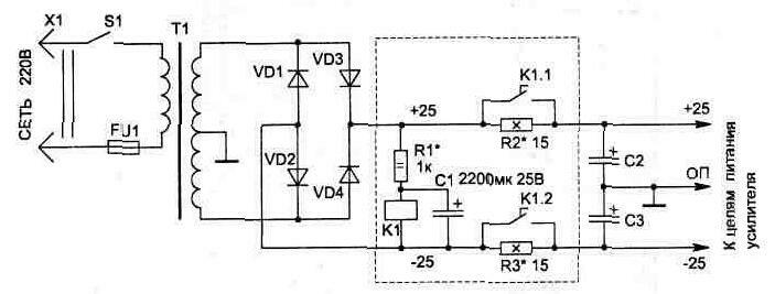 Это простое приспособление позволяет повысить надежность вашей радиоаппаратуры и уменьшить помехи в сети в момент включения. Любой блок питания радиоаппаратуры содержит выпрямительные диоды и конденсаторы большой емкости. В начальный момент включения сетевого питания происходит импульсный скачок тока — пока идет заряд емкостей фильтра. Амплитуда импульса тока зависит от величины емкости и напряжения на выходе выпрямителя. Так, при напряжении 45 В и емкости 10000 мкФ ток зарядки такого конденсатора может составить 12 А. При этом трансформатор и выпрямительные диоды кратковременно работают в режиме короткого замыкания. Для устранения опасности выхода этих элементов из строя путем уменьшения броска тока в момент первоначального включения и служит приведенная на рис. 1.7 схема. Она также позволяет облегчить режимы и других элементов в усилителе на время переходных процессов. Рис. 1.7 В начальный момент, когда подано питание, конденсаторы С2 и СЗ будут заряжаться через резисторы R2 и R3 — они ограничивают ток до безопасного для деталей выпрямителя значения. Через 1...2 секунды, после того как зарядится конденсатор С1 и на пряжение на реле К1 возрастет до величины, при которой оно сработает и своими контактами К1.1 и К1.2 зашунтирует ограничительные резисторы R2, R3. В устройстве можно использовать любое реле с напряжением срабатывания меньшим, чем действует на выходе выпрямителя, а резистор R1 подбирается таким, чтобы на нем падало "лишнее" напряжение. Контакты реле должны быть рассчитаны на действующий в цепях питания усилителя максимальный ток. В схеме применено реле РЭС47 РФ4.500.407-00 (РФ4.500.407-07 или др.) с номинальным рабочим напряжением 27 В (сопротивление обмотки 650 Ом; ток, коммутируемый контактами, может быть до 3 А). Фактически реле срабатывает уже при 16...17 В, а резистор R1 выбран величиной 1 кОм, при этом напряжение на реле будет 19...20 В. Конденсатор С1 типа К50-29-25В или К50-35-25В. Резисторы R1 типа МЛТ-2, R2 и R3 типа С5-35В-10 (ПЭВ-10) или аналогичные. Величина номиналов резисторов R2, R3 зависит от тока нагрузки, и их сопротивление может быть значительно уменьшено. Рис. 1.8 Вторая схема, приведенная на рис. 1.8, выполняет ту же самую задачу, но позволяет уменьшить габариты устройства за счет использования времязадающего конденсатора С1 меньшей емкости. Транзистор VT1 включает реле К1 с задержкой, после того как зарядится конденсатор С1 (типа К53-1А). Схема позволяет также вместо коммутации вторичных цепей обеспечивать ступенчатую подачу напряжения на первичную обмотку. В этом случае можно использовать реле только с одной группой контактов. Величина сопротивления R1 (ПЭВ-25) зависит от мощности нагрузки и выбирается такой, чтобы напряжение во вторичной обмотке трансформатора составляло 70 процентов от номинального значения при включенном резисторе (47...300 Ом). Настройка схемы состоит в установке времени задержки включения реле подбором номинала резистора R2, а также выборе R1. Приведенные схемы можно использовать при изготовлении нового усилителя или же при модернизации уже существующих, в том числе и промышленного изготовления. По сравнению с аналогичными по назначению устройствами