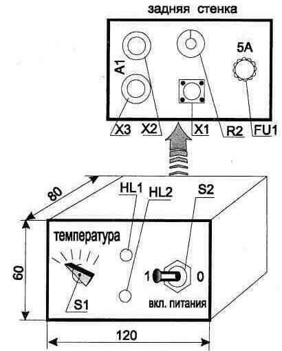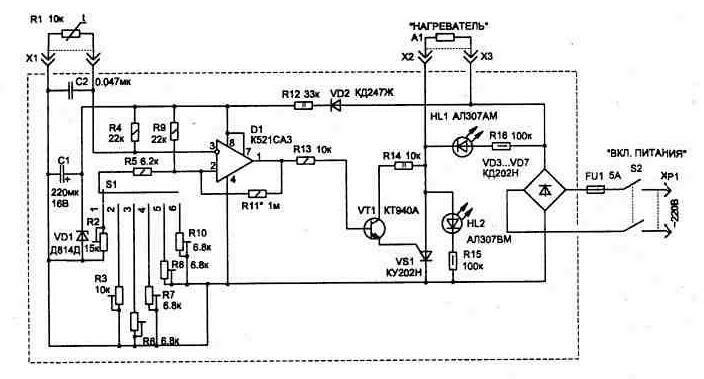 Устройство является универсальным и предназначено для поддержания фиксированного значения заданной положительной температуры в диапазоне +1...80 °С с точностью 0,2 °С. Термостабилизатор может применяться в искусственном инкубаторе для выведения цыплят из яиц (+37,5 °С), сушильном шкафу (+60 °С), домашней бане или же поддерживать положительную температуру (+2 °С) в утепленном хранилище для овощей на балконе при отрицательной температуре окружающего воздуха. При этом на работе устройства не сказывается возможная нестабильность сетевого напряжения. П!итается устройство по бестрансформаторной схеме (рис. 1.15) непосредственно от сети 220 В, что позволяет значительно уменьшить его габариты. Принцип работы схемы на компараторе D1 в особых пояснениях не чуждается — он часто применяется в различных устройствах и описан в литературе. Особенностью данного включения компаратора является управление выходной нагрузкой по эмиттерному выходу микросхемы. Использование транзистора VT1 позволяет улучшить работу компаратора и упростить схему управления тиристором. В качестве нагревателя подойдет любая нагрузка мощностью не более 1000 Вт (я использовал "воздушный" ТЭН на 500 Вт — он более долговечен, чем нагреватель в виде лампочки). Если же требуется управлять более мощной нагрузкой, то диоды VD3...VD7 необходимо применять на больший допустимый рабочий ток (например Д246А, Б, Д247А, Б) и подключить дополнительный тиристор совместно с еще одним транзистором КТ940А аналогично с приведенной схемой. Сигнал управления второй нагрузкой (она подключается к отдельным гнездам) снимается с вывода D1/1. Рис. 1.15 Для управления нагрузкой мощностью более 1000 Вт можно применить один тиристор типа Т122-20-4 или Т122-25-4 (последняя цифра в обозначении может быть и больше). Индикаторами режимов работы схемы являются светодиоды HL1, HL2. Так, при включении устройства тумблером S2, если не подключен нагревательный элемент А1 (или он перегорел), то светиться будут одновременно оба светодиода, а при нормальной работе устройства свечение между индикаторами будет чередоваться: при нагреве А1 светится красный светодиод HL1 (тиристор открыт), при остывании HL2 — зеленый. В схеме применен в качестве датчика температуры терморезистор типа СТЗ-19 (он обладает малыми габаритами и массой), но подойдут и другие типы (при этом может возрасти инерционность термостабилизации). Для удобства эксплуатации термостабилизатора используется переключатель (S1), который позволяет иметь 5 фиксированных значений температуры и одно изменяемое. В шестом положении переключателя переменный резистор R2 позволяет устанавливать любую температуру в указанном диапазоне. Наиболее часто используемые значения температуры удобно настроить резисторами R3, R6...R8, R10 (многооборотные, типа СП5-2) в соответствующих положениях переключателя. В схеме применены постоянные резисторы типа С2-23; переменный резистор R2 типа СП2-2; конденсатор С1— К50-15, С2 — К10-7В; переключатель S1 типа ПГ2-5-6П2Н; тумблер S2 типа ТЗ; разъем Х1 — РС-4; гнезда Х2, ХЗ типа Г4,0 . При изготовлении конструкции необходимо преду смотреть теплоотвод для тири стоpa VSI и диодов VD3...VD7. Внешний вид конструкции корпуса показан на рис. 1.16. Выполняется он из диэлектрических материалов. Соединительный кабель от гнезда Х1 до термодатчика может иметь длину до двух метров и выполняется перевиты