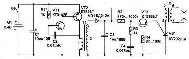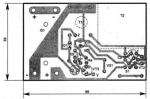 В журналах приведено много схем для самостоятельного изготовления аналогичных по назначению устройств, однако, как показывает опыт, наибольшую сложность при изготовлении таких устройств представляет намотка высоковольтной катушки так, чтобы не было пробоя у нее внутри, а также изготовление красивого корпуса. Приводимая ниже схема и конструкция легко решает эти проблемы. Рис. 1.24 Электрическая схема (рис. 1.24) содержит только унифицированные и легко доступные детали, в том числе и высоковольтную катушку Т2, в качестве которой применен трансформатор строчной развертки от черно-белых миниатюрных телевизоров ТВС-70П1. Предлагаемая схема позволяет снять зависимость напряжения подаваемого в высоковольтную катушку от порога срабатывания динистора (их наиболее часто применяют), как это реализуется в опубликованных ранее схемах. Схема состоит из автогенератора на транзисторах VT1 и VT2, повышающего напряжение до 120...160 В с помощью трансформатора Т1 и схемы запуска тиристора VS1 на элементах VT3, С4, R2, R3, R4. Накопленная на конденсаторе СЗ энергия разряжается через обмотку Т2 и открытый тиристор. Рис. 1.25 Трансформатор Т1 выполнен на кольцевом ферритовом магнитопроводе М2000НМ1 типоразмера К16х10х4,5 мм. Обмотка 1 содержит 10 витков, 2 — 650 витков проводом ПЭЛШО-0,12. Используются конденсаторы: С1, СЗ типа К50-35; С2, С4 типа К10-7 или аналогичные малогабаритные. Диод VD1 можно заменить на КД102А, Б. S1 — микровключатель типа ПД-9-2. Тиристор можно использовать любой, с рабочим напряжением не менее 200 В. Трансформаторы Т1 и Т2 крепятся к плате клеем. Печатная плата устройства имеет размеры 88х55 мм (см. рис. 1.25). Вся схема вместе с двумя элементами питания А316 или аккумуляторами НКГЦ-0,45 легко размещается в пачке от сигарет с жестким каркасом (типа СТОЛИЧНЫЕ) (рис. 1.26). Разрядная камера располагается между двумя жесткими проводами диаметром 1...2 мм на расстоянии 80...100 мм от корпуса. Искра между электродами проходит на расстоянии 3...4 мм. Схема потребляет ток не более 180 мА, и ресурса элементов питания хватит более чем на два часа непрерывной работы, однако не прерывная работа устройства более одной минуты не желательна из-за возможного перегрева транзистора VT2 (он не имеет радиатора). При настройке устройства может потребоваться подбор элементов R1 и С2, а также изменение полярности включения обмотки 2 у трансформатора Т1. Желательно также проводить настройку с неустановленным R2: проверить напряжение на конденсаторе СЗ вольтметром, а после этого установить резистор R2 и, контролируя напряжение осциллографом на аноде тиристора VS1, убедиться в наличии процесса разряда конденсатора СЗ. Разряд СЗ через обмотку трансформатора Т2 происходит при открывании тиристора. Короткий импульс для открывания тиристора формируется транзистором VT3 при возрастании напряжения на конденсаторе СЗ более 120В. Устройство может найти и другие применения, например,