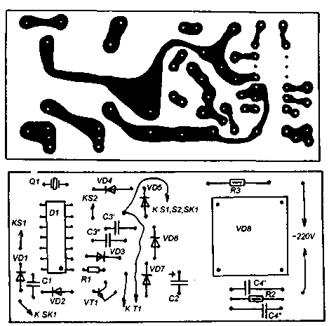 Puc.2 Плата сделана из гетинакса с односторонней фольгировкой. Можно использовать и другой фольгированный изоляционный материал, применяющийся для печатных плат. На плате не размещаются кнопки S1 и S2 (SK1 выводится на входную дверь) и трансформатор. Микросхема может быть УМС-8 или УМС-7, дополнительные цифры (например УМС-8-08) говорят о музыкальном репертуаре микросхемы. Кнопки S1 и S2 располагаются на корпусе звонка, с помощью кнопки S1 можно выбрать мелодию для дальнейшего проигрывания, а кнопкой S2 можно остановить воспроизведение. Конденсаторы С3 и С4 составлены каждый из двух параллельно включенных конденсаторов на 0,33 мкФ каждый, на монтажной схеме они отмечены как СЗ' СЗ" и С4' С4". Выпрямительный мост КЦ405А можно заменить мостом, собранным из диодов КД105В или КД209В,Д226. При отсутствии готовой основы можно использовать трансформатор от выходного каскада старого транзисторного приемника и любой динамик на 0,1-3 Вт. Налаживание правильно собранного устройства из исправных деталей заключается в подборе номинала конденсатора С1 таким образом, что бы при нажатии на SK1 происходило полное однократное воспроизведение музыкального фрагмента. Если емкость С1 будет слишком велика автомат может воспроизводить мелодию несколько раз подряд. При необходимости можно подобрать более точно емкость СЗ, так чтобы тембр и громкость звучания были оптимальными. Литература: 1. 'На микросхемах серии УМС". ж. Радио 12-1995, стр. 40-41. Радиоконструктор 3/2001, с.28-29.