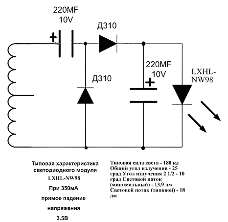 Большой прорыв в технологиях производства сверхъярких светодиодов позволил получить реальные светодиодные модули с к.п.д. в 8-10 раз выше, чем у ламп накаливания. Одним из лидеров в этой гонке является модуль фирмы Luxeon Lumiled LXHL-NW98. Я попробовал заменить лампочку фонарика “Жучёк” производства Краснодарского завода ЗИП на этот светодиод. Для этого пришлось сделать умножитель напряжения на диодах с малым падением напряжения (диодами Шотки или германиевыми). Эффект превзошёл все мои ожидания! Я получил ослепительно яркий фонарик, с очень легким жимом по сравнению с ламповым вариантом. ![]()