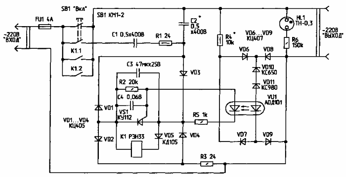 Аварийное отключение при повышении напряжения до 250 В происходит благодаря шунтированию обмотки реле тиристором VS1. VS1 открывается под управлением оптопа-ры VU1. Стабилитроны VD10, VD11 и резистор R4 подобраны так, что VS1 открывается при напряжении сети выше 250 В. Оптопара VU1 должна быть с током управления около 20 мА. Возможна замена ее небольшим разделительным трансформатором. Он включается вторичной обмоткой вместо R2. Реле К1 может быть любого типа с контактами, выдерживающими максимальный ток нагрузки (РЭС9, РЭС22, РЭНЗЗ). Для каждого типа реле необходимо подобрать емкости: С1 —для надежного включения устройства и С2 — для отключения при снижении напряжения до 160...170 В. Суммарное напряжение стабилизации VD10, VD11 должно быть около 330...340 В. Можно применить стабилитроны других типов, например Д817. Вместо моста VD6...VD9 можно использовать один диод (КД209), включенный последовательно с VD 10, VD 11. При этом контролироваться будет только одна полярность переменного напряжения, чего в большинстве случаев достаточно. Диод VD5, включенный последовательно с обмоткой реле К1, уменьшает время его выключения при откры-вании тиристора VS1. Быстродействие устройства не измерялось, но ориентировочно оно составляет несколько десятков миллисекунд (зависит в основном от типа реле К1) и надежно защищает нагрузку от перегорания. С4 устраняет ложные срабатывания устройства от ВЧ-помех.