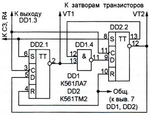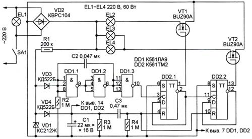Предлагаемое устройство позволяет с помощью обычного выключателя с одной парой контактов управлять люстрой с четырьмя лампами, включая одну, две, три или все четыре. При первом после продолжительного ( более 15 с ) отключения замыкании контактов выключателя SA 1 будет включена только лампа EL 1, на которую сетевое напряжение подается непосредственно. Пульсирующее напряжение, поступающее с диодного моста VD 2 через резистор R 1, ограничено стабилитроном VD 1 до 12 В. Почти до этого значения через диод VD 4 будет заряжен конденсатор С 1. Снимаемое с него напряжение питает микросхемы DD 1 и DD 2. Импульс, формируемый дифференцирующей цепью R 4 C 3 в процессе нарастания питающего напряжения, устанавливает триггеры микросхемы DD 1 в исходное состояние с низкими логическими уровнями на выходах 1 и 13. В результате полевые транзисторы VT 1 и VT 2 остаются закрытыми, а лампы EL 2 - EL 4 - выключенными . Так как конденсатор С 2 не успевает заметно зарядиться в паузах между импульсами частотой 100 Гц, поступающими через диод VD 3, уровень на счетном входе триггера DD 2.1 остается низким. Состояние триггеров, а с ними и ламп EL 2 - EL 4 не изменяется. Если разомкнуть контакты выключателя SA 1, напряжение на стабилитроне VD 1 упадет до нуля, но на конденсаторе С 1 оно некоторое время будет оставаться почти неизменным, продолжая питать микросхемы. Через 30 мс, требующихся для зарядки конденсатора С 2 до уровня переключения элемента DD 1.1, состояние всей цепочки элементов DD 1.1 - DD 1.3 изменится на противоположное. Нарастающим перепадом уровня на входе С триггер DD 2.1 будет переведен в состояние с высоким уровнем на выходе 1. При последующем замыкании выключателя SA 1 напряжение на не успевшем заметно разрядиться конденсаторе С 1 возрастет незначительно и импульс начальной установки триггеров сформирован не будет. Вследствие этого, кроме лампы EL 1, загорится и лампа EL 2, цепь питания которой будет замкнута открытым транзистором VT 1. Еще одно кратковременное размыкание выключателя возвратит триггер DD 2.1 в прежнее состояние, но высокий уровень будет установлен на выходе 13 триггера DD 2.2. Будут включены три лампы - EL 1, EL 3 и EL 4. И, наконец , третий щелчок выключателя включит все четыре лампы. Далее цикл повторяется. Необходимая для управления люстрой продолжительность размыкания контактов выключателя может находиться в интервале от 30 мс приблизительно до 15 с, что очень просто выдержать вручную. Если устройство остается выключенным более длительное время, достаточное для полной разрядки конденсатора С 1 током, потребляемым микросхемами и текущим через резистор R 3, то при включении триггеры перейдут в исходное состояние и загорится только одна лампа люстры. Продолжительность выключения люстры, необходимую для возврата в исходное состояние, можно уменьшить или увеличить, соответственно изменив номинал резистора R 3. Предел ее увеличения зависит от тока, потребляемого микросхемами, и от тока утечки конденсатора С 1. В устройстве могут быть применены резисторы и конденсаторы любого типа. Номиналы элементов цепей R 2 C 2, R 3 C 1 и R 4 C 3 можно уменьшать или увеличивать в несколько раз, но так, чтобы произведение сопротивления резистора на емкость соответствующего конденсатора ( постоянная времени ) оставалось неизменным. Полевые транзисторы с изолированным затвором VT 1, VT 2 и диодный мост VD 2 должны выдерживать н