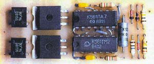 Внешний вид именно такого варианта устройства управления показан ниже. Установленные здесь два диодных моста DB 156 соединены параллельно для увеличения допустимого импульсного тока. Чертеж печатной платы не приводится, так как значительная часть соединений выполнена навесными проводами. До установки в люстру изготовленное устройство следует проверить на работоспособность. Рекомендуется делать это при пониженном до безопасного значения напряжении, подаваемом через трансформатор. Лампы на 220 В можно временно заменить низковольтными мощностью несколько ватт или использовать вместо них резисторы соответствующего сопротивления и мощности. На время налаживания параллельно резистору R1 временно подключите еще один, сопротивлением 1 кОм, только не забудьте его удалить прежде, чем подавать напряжение 220 В по окончании проверки.
