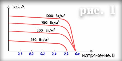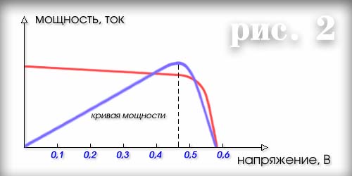 Напряжение холостого хода, генерируемое одним элементом, слегка изменяется при переходе от одного элемента к другому в одной партии и от одной фирмы изготовителя к другой и составляет около 0.6 В. Эта величина не зависит от размеров элемента. По иному обстоит дело с током. Он зависит от интенсивности света и размера элемента, под которым подразумевается площадь его поверхности. Элемент размером 100*100 мм в 100 раз превосходит элемент размером 10*10 мм и, следовательно, он при той же освещенности выдаст ток в 100 раз больший. Нагружая элемент, можно построить график зависимости выходной мощности от напряжения, получив нечто подобное изображенному на рис.2