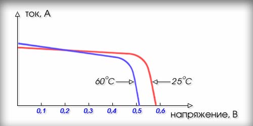 Пиковая мощность соответствует напряжению около 0,47 В. Таким образом, чтобы правильно оценить качество солнечного элемента, а также ради сравнения элементов между собой в одинаковых условиях, необходимо нагрузить его так, чтобы выходное напряжение равнялось 0,47 В. После того, как солнечные элементы подобраны для работы, необходимо их спаять. Серийные элементы снабжены токосъемными сетками, которые предназначены для припайки к ним проводников. Батареи можно составлять в любой желаемой комбинации. Простейшей батареей является цепочка из последовательно включенных элементов. Можно также соединить параллельно цепочки, получив так называемое последовательно-параллельное соединение. Важным моментом работы солнечных элементов является их температурный режим. При нагреве элемента на один градус свыше 25оС он теряет в напряжении 0,002 В, т.е. 0,4 %/градус. На рис.3 приведено семейство кривых ВАХ для температур 25о С и 60о С.
