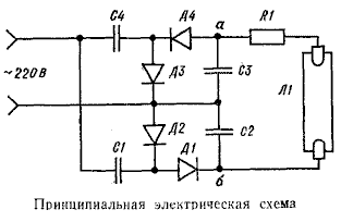 Конденсаторы С1, С4 должны быть бумажными, с рабочим напряжением в 1,5 раза больше питающего напряжения. Конденсаторы С2, СЗ желательно чтобы были слюдяными. Резистор R1 обязательно проволочный, по мощности лампы, указанной в таблице.
