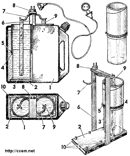 обечайка (ватман), Изготовление самодельных электролизеров для получения активированой воды ведется в основном по следующей схеме: стеклянная банка с водой, в нее опущен также наполненный водой брезентовый мешочек, а в обе эти емкости введены электроды из листовой нержавеющей стали, один из которых включается в сеть напрямую, а другой - через диод на 5—10 А (например, типа Д242). Процесс активизации длится несколько минут (при затягивании его вода может закипеть). Такие приборы небезопасны и не лишены недостатков. И прежде всего изготовители подобных активаторов забыли первый закон Фарадея, по которому вовсе не надо стремиться применять “большие амперы”: с тем же успехом можно обойтись и миллиамперами, соответственно удлинив сеанс воздействия — при малых токах это перегревом не грозит. Не потребуется и мощный дорогой диод — его заменит более простой, копеечной стоимости, рассчитанный на максимум выпрямленного тока порядка 0,3 А (например, типа Д7Ж или с любой другой буквой на конце). Ради большей надежности можно включить в цепь параллельно два таких диода. Активатор с режимом работы на миллиамперах намного безопаснее: прибор может долго оставаться включенным, а вода в нем, чуть потеплев вначале, дальше не греется, поскольку по мере активации ток становится меньше начальных его значений в 2—4 раза. Конечные же результаты активации будут совершенно равноценными режиму с “большими” амперами: ведь они одинаковы, пойдет ли через прибор ток в 5 А в течение 5 мин (300 с) или 0,05 А за 500 мин (30000 с): 5Х300=0,05Х30000=1500. Итоговое число — это количество единиц электрического заряда (кулонов), пропущенных через воду в обоих режимах активации. Устройство активатора на малых токах понятно из рисунка. В небольшую пластмассовую канистру с отрезанным верхом устанавливаются два обычных тонких стакана, стенки которых наращены обечайками из ватмана. Все три эти емкости заполняются водой, в стаканы опускаются электроды — прибор готов к подключению. Вода в канистре будет передаточной средой для тока, а анолит и католит получим в стаканах. Чтобы стаканы было удобнее вынимать по окончании процесса, из листового полистирола изготовлен простой поддон со стойками и перемычкой-ручкой, на которой крепятся вилочный разъем и проволочные крючки для подвешивания электродов (как это принято в гальванотехнике). Обечайки для наращивания стаканов вырезаются из листа ватмана 110х500 мм, предварительно прокипяченного для удаления из бумаги технологического клея. Полученные заготовки туго наматываются на края стаканов и закрепляются нитками.