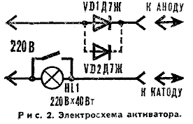 На схеме электропитания активатора изображена лампа на 220 В мощностью 40 Вт. Простой переключатель позволяет закоротить ее, когда желательно ускорить процесс. Лампа выполняет роль предохранителя для диода. Кроме того, по изменению степени накала ее нити можно судить о стадии активации: в конце процесса она горит тусклее.
